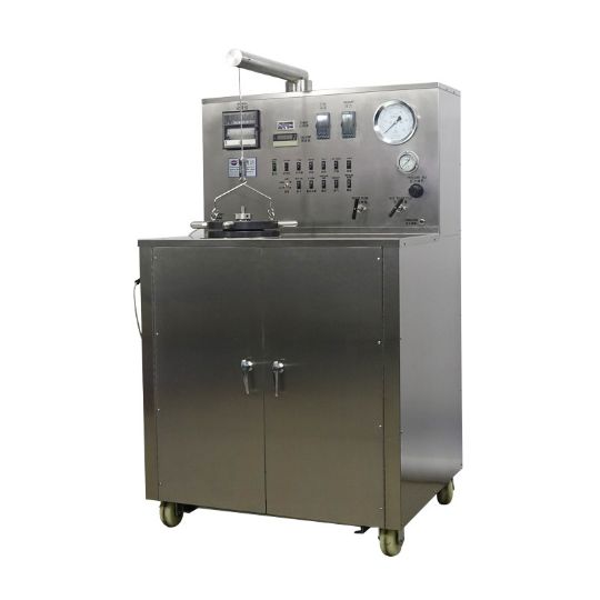 Консистометр HPHT (высокого давления и температуры) состоит из вращающегося цилиндрического стакана для суспензии, оснащенного неподвижной лопастью, заключенной в камеру высокого давления, рассчитанную на рабочее давление 275 МПа (40 000 psi) при максимальной температуре 315°C (600°F). (Пневматический гидравлический насос создает давление в цилиндре в сборе.) Гидравлическая система включает в себя резервуар, трубопроводы, клапаны и фильтры. Тепло подается в камеру с помощью внутреннего трубчатого нагревателя мощностью 5 кВт, управляемого программой автоматической системы контроля температуры. Для определения температуры масла в камере и раствора в ячейке предусмотрены термопары.